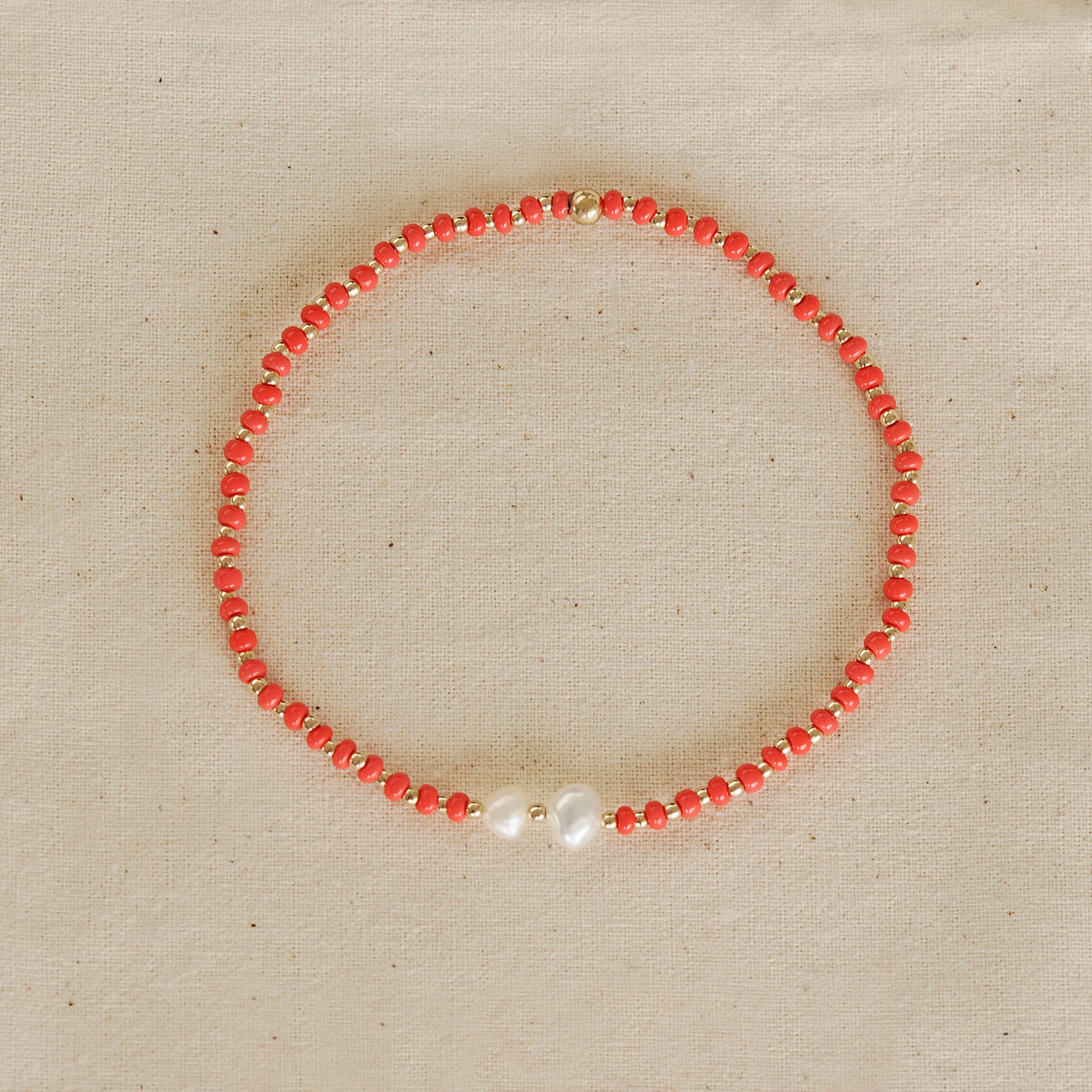 Radiating coastal charm, the Shelley Anklet is your perfect mix of fun and elegance. Featuring coral-toned beads, 14k gold-filled accents, and two lustrous freshwater pearls, this design brings a warm, golden glow to every step. Add a touch of colour and sophistication to your everyday.