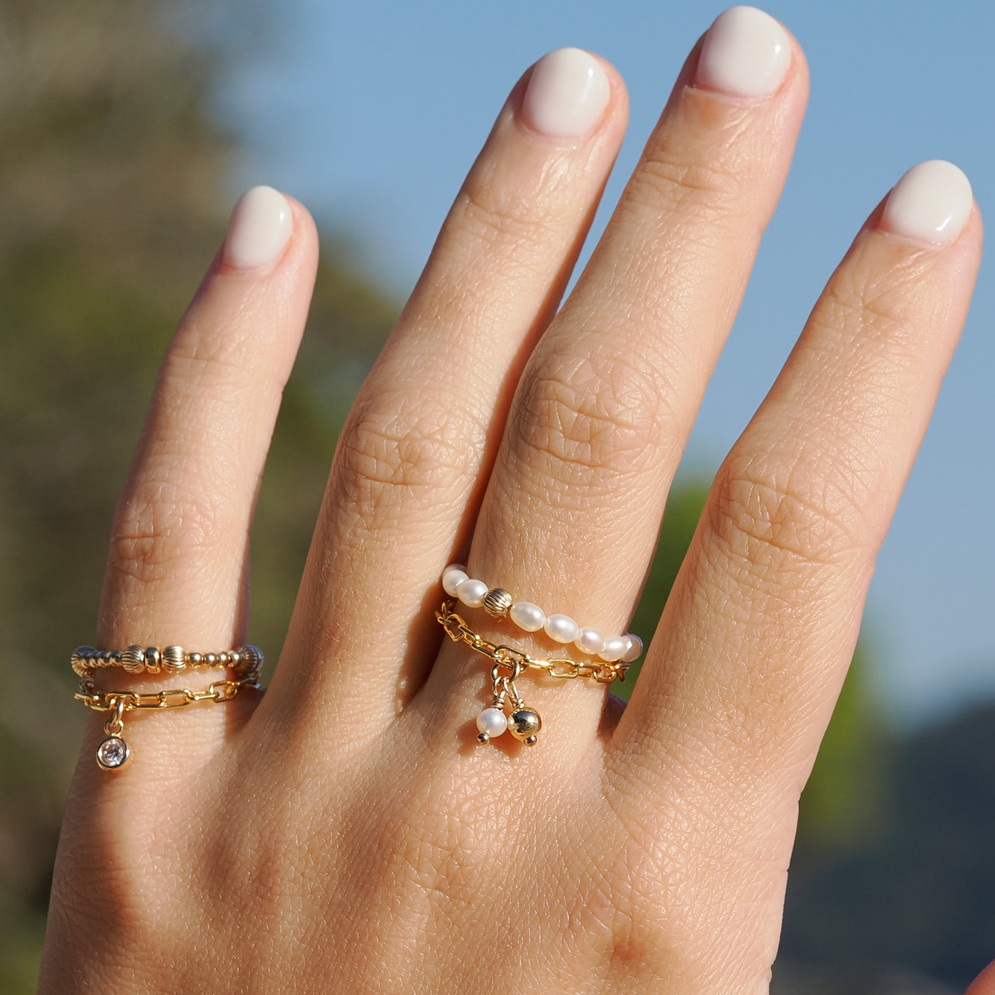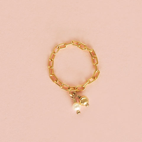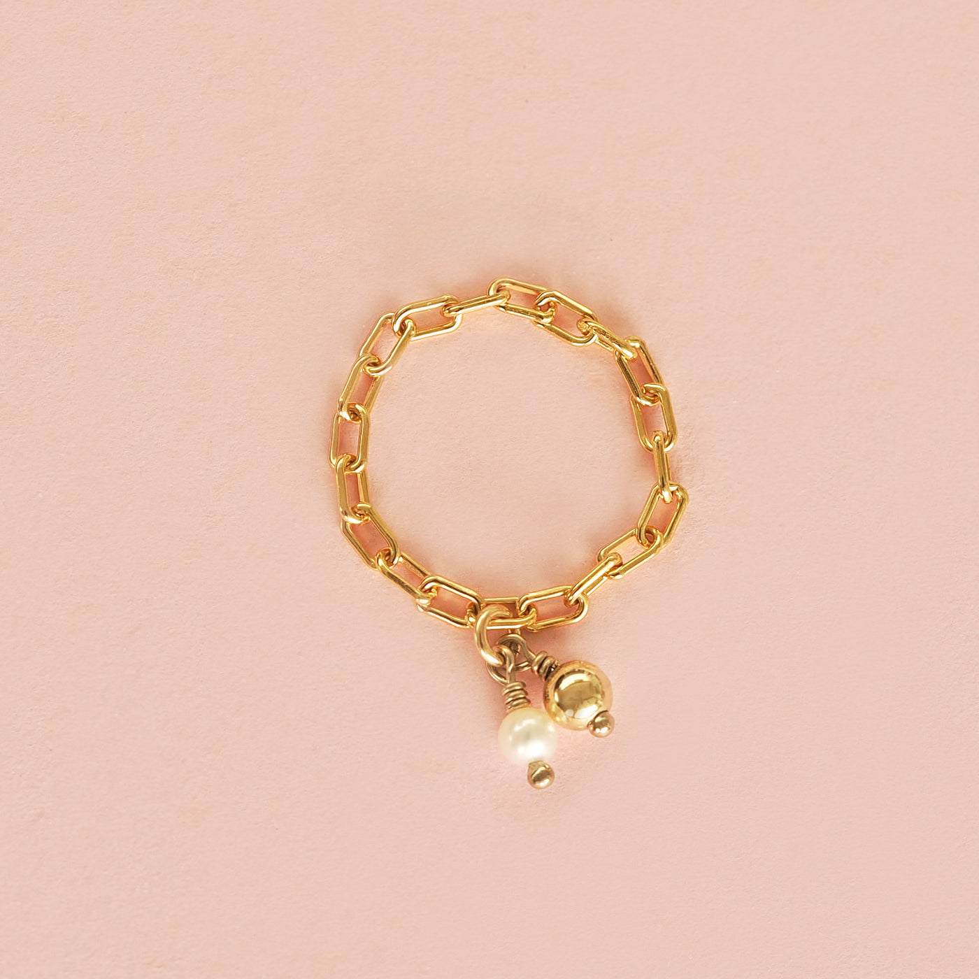 The Marina Link Ring pairs a glowing 14k gold-filled bead with a lustrous freshwater pearl, dangling from a delicate paperclip chain. Elegant and playful, it’s a piece that captures seaside charm and effortless style.